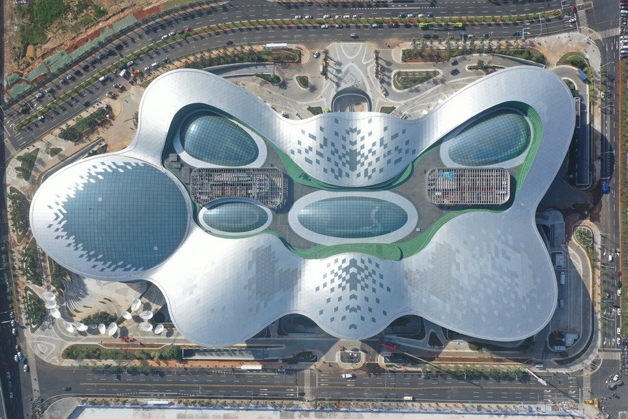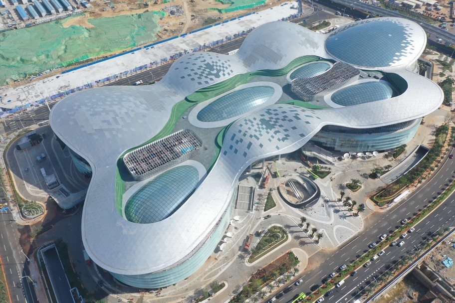 本项目是海南自由贸易港的一项“超级工程”,总用钢量约为4.1万吨,南北约360 米,东西向约190 米,接近国家体育馆“鸟巢”体量。外立面超大玻璃幕墙包含7000块玻璃和23000块铝板,造型屋面包含2100块玻璃和66000块铝板,外幕墙围绕8000米灯带和4000灯具,是外观主视觉中最亮眼的存在。